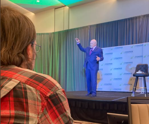 He spoke about failure, family, loving people well, and faith. He shared ranching mishaps with cattle and how, after he was established and able to afford it, he raised pigs to donate to food shelves and called the program “Pigs for Jesus.” He really knew how to keep the crowd on their toes! And then unexpectedly, he stepped into the audience to greet people — and I found myself giving him a big hug.